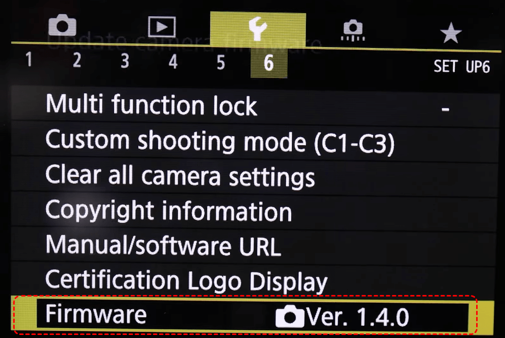 Step 1. Turn on your camera and check the current firmware version in the menu under Setup/Tools.