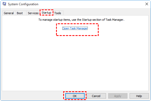 Step 3. Click "Open Task Manager" and select "Startup" tab, disable all apps.