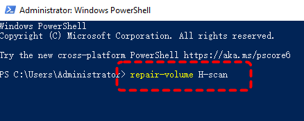 Step 2. Enter the following command "Repair-Volume H[DriveLetter]-scan" and press "Enter" key. Replace the drive letter "H" with your actual drive letter.