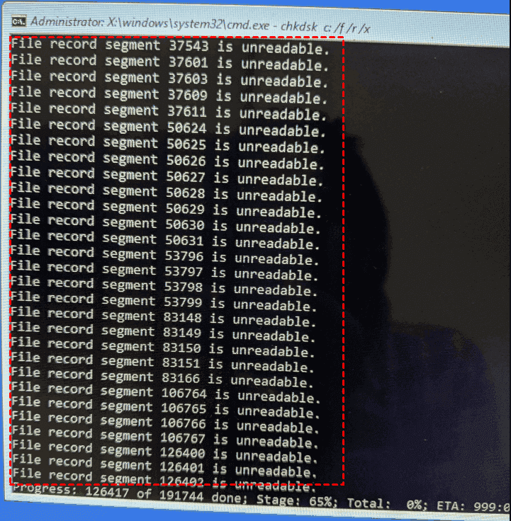 There are some reasons should are responsible for the CHKDSK showing a file record segment is unreadable error: