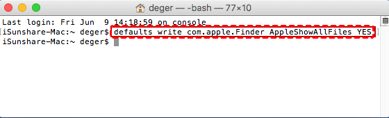 Step 2. Type the command and press Enter: defaults write com.apple.finder AppleShowAllFiles YES