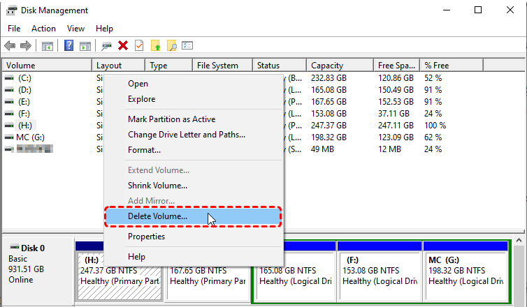 Step 2. In the Disk Management window, find your SD card under Volume or Disk. Be very careful to identify the correct disk because selecting the wrong disk can lead to data loss on your other drives.