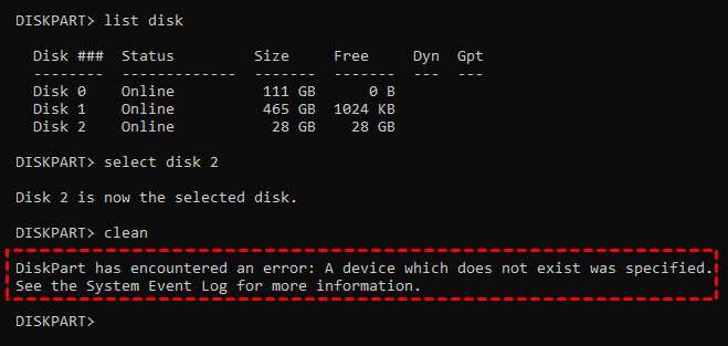 DiskPart has encountered an error: A device which does not exist was specified. Check the System Event Log for more information.