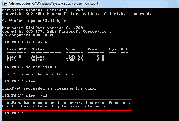 DiskPart has encountered an error: Incorrect Function. Check the System Event Log for more information.