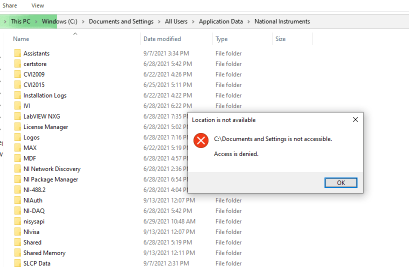Why do I see "Documents and Settings access denied" on Windows 10?