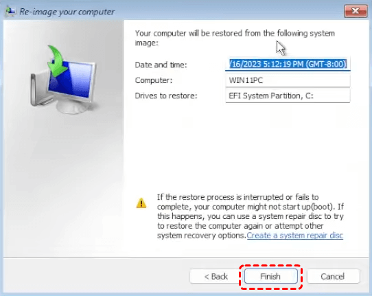 Click "Finish", then confirm with "Yes". Windows will begin the recovery process. Once the restoration completes, your PC will restart automatically.