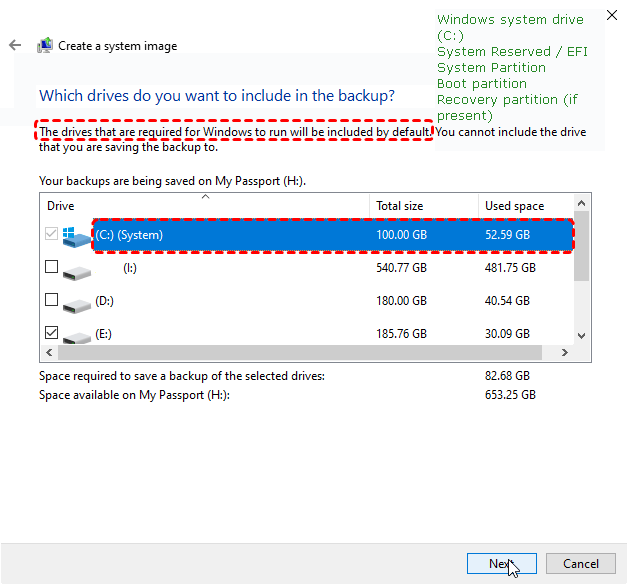 During the creation process, Windows automatically selects the boot drive and other system-required partitions because these are essential for the operating system to run after restoration. These mandatory components typically include:
