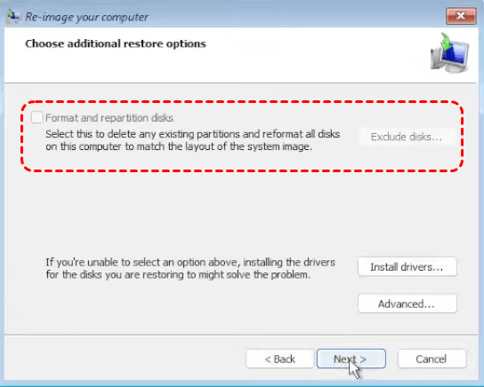 - Format and repartition disks: Erases and recreates partitions to match the system image.