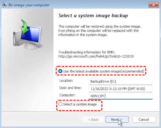 Choose the Windows installation you want to restore. Windows will automatically detect the latest system image. You can choose: