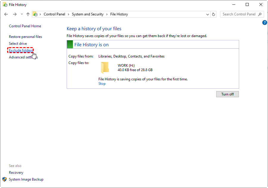 Step 2. Click "Exclude folders" and click "Add" to choose folders to exclude from File History backup.