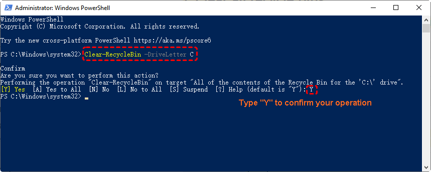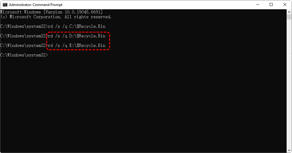 Then, you can empty each drive’s Recycle Bin by running the corresponding command: