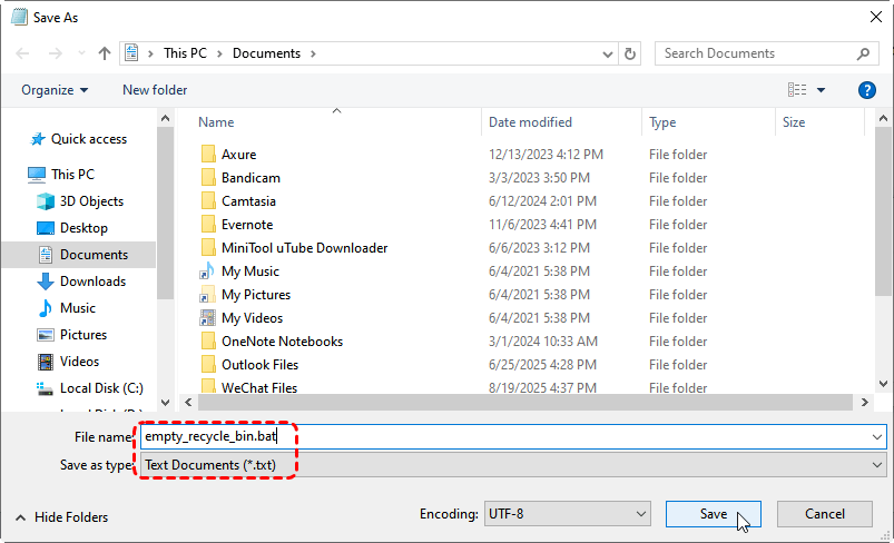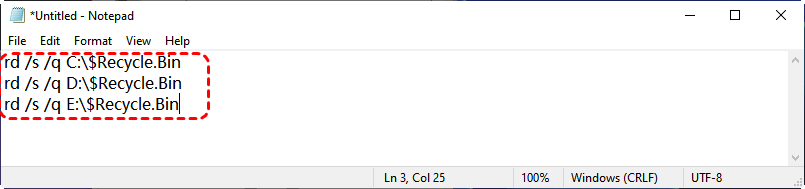 2. Save the file with a ".bat" extension (e.g., "empty_recycle_bin.bat").