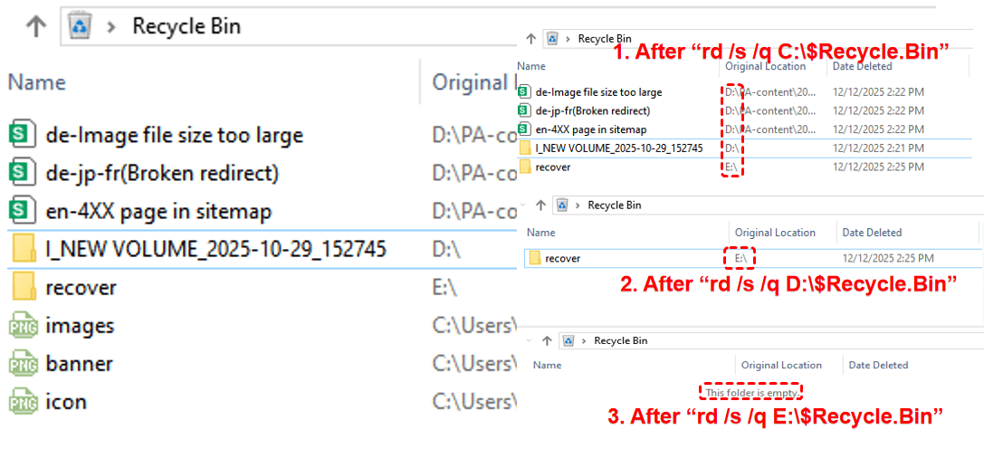 After you run all the commands, you can see all files deleted from C:, D:, E: drives are also permanently removed from Recycle Bin.