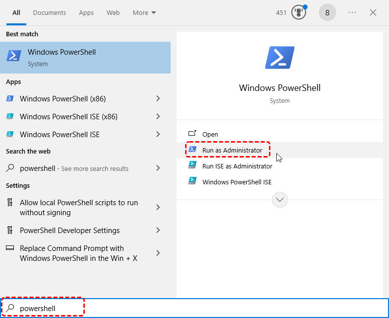 Or search PowerShell in the Start menu, and select "Run as Administrator".