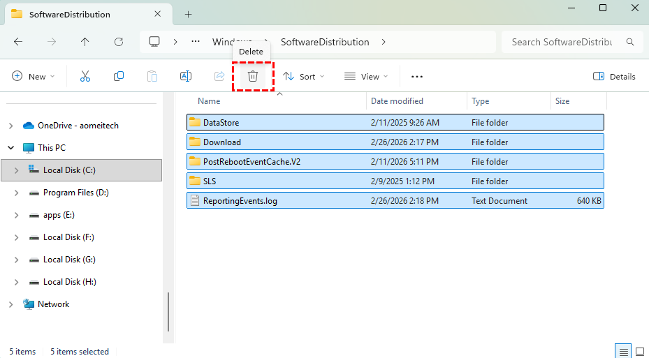 3. Navigate to C:\Windows\SoftwareDistribution and delete everything inside.