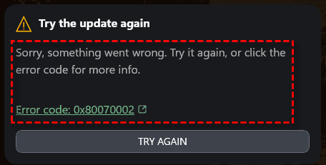 - Try the update again. Sorry, something went wrong. Try it again, or click the error code for more info. Error code: 0x80070002