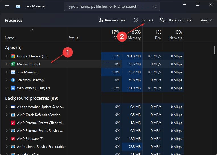 2. Locate Microsoft Excel in the list of running processes.