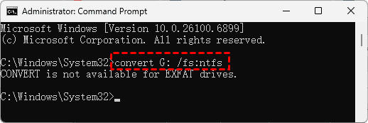 After backing up your crucial files, you can convert exFAT to NTFS without losing data now. Some users say that you can use the Convert command to convert exFAT to NTFS (convert E: /fs:ntfs). However, it’s not available. The Windows convert command is specifically designed for changing FAT/FAT32 file systems to NTFS and does not support exFAT. When you try to use it on an exFAT volume, you receive an error message indicating that CONVERT is not available for exFAT drives.