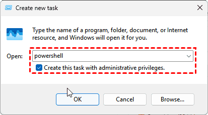 2. Type PowerShell and ensure the administrative privileges box is checked. Click OK.