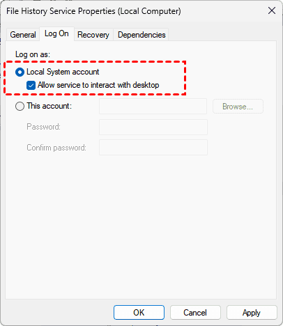 4. This is critical. It should be set to "Local System account", and the checkbox for "Allow service to interact with desktop" should be selected.