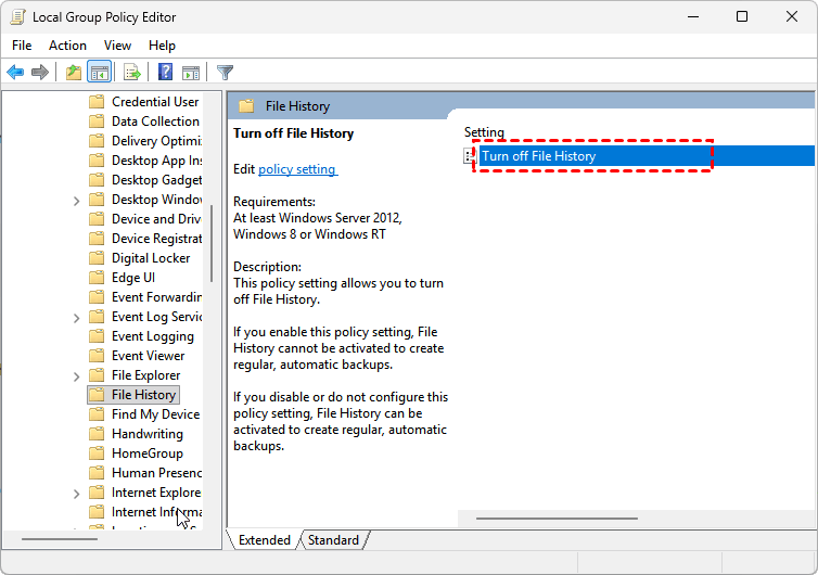 2. Ensure that "Turn off File History" is set to "Not Configured" or "Disabled".