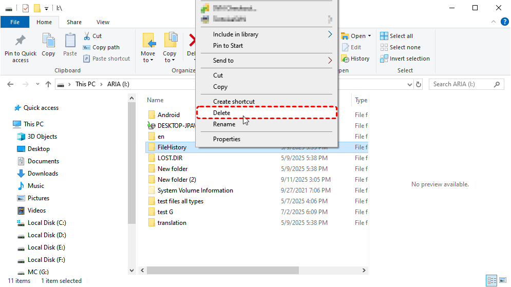 Step 2. Manually delete the FileHistory folder from the backup drive: access the folder in the backup drive in Windows File Explorer; right-click the folder and choose "Delete".