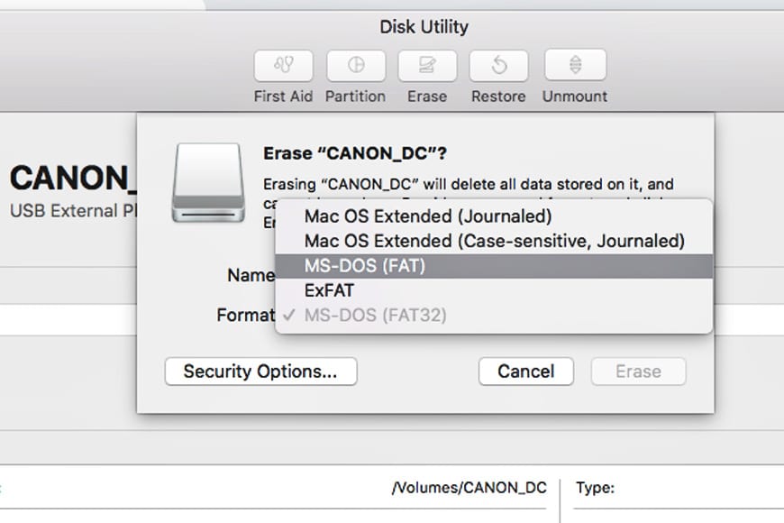 3. Choose "MS-DOS (FAT) ". Click "Erase".