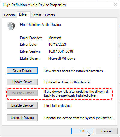 Step 2. Go to Driver tab and click on "Roll Back Driver".