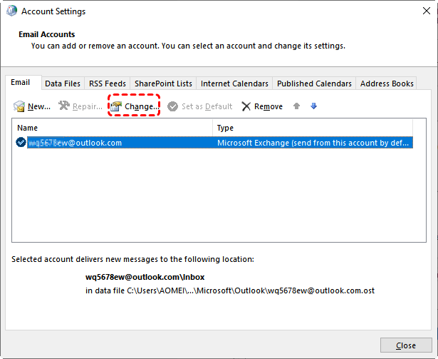 Step 2. Select your email account and click "Change".