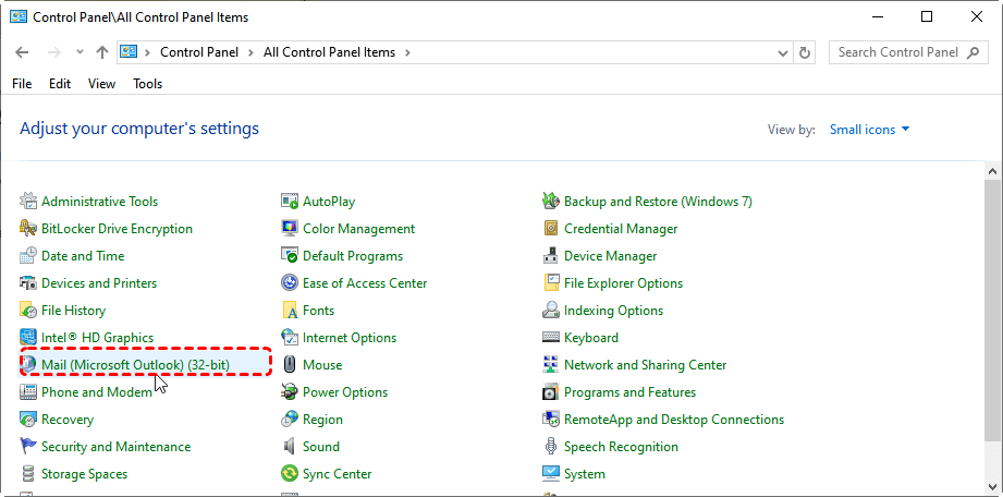 Step 2. Open Control Paneland click Mail (Microsoft Outlook). If you don’t see Mail, change View by: to Small icons.