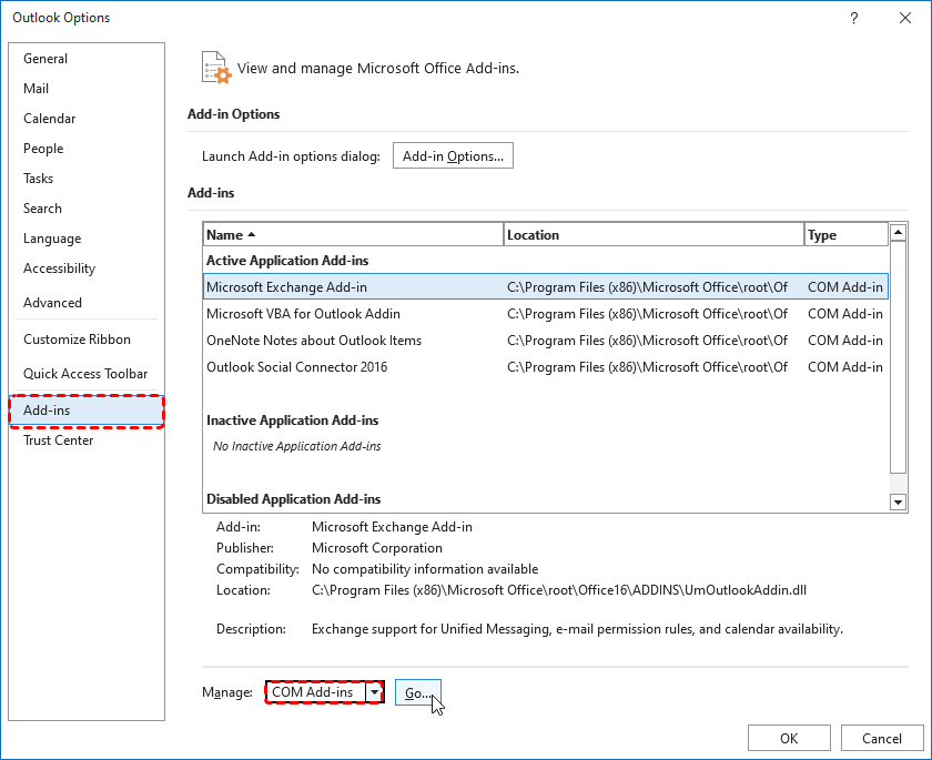 Step 2. Access to "Add-ins" tab.At the bottom, select "COM Add-ins" and click "Go".