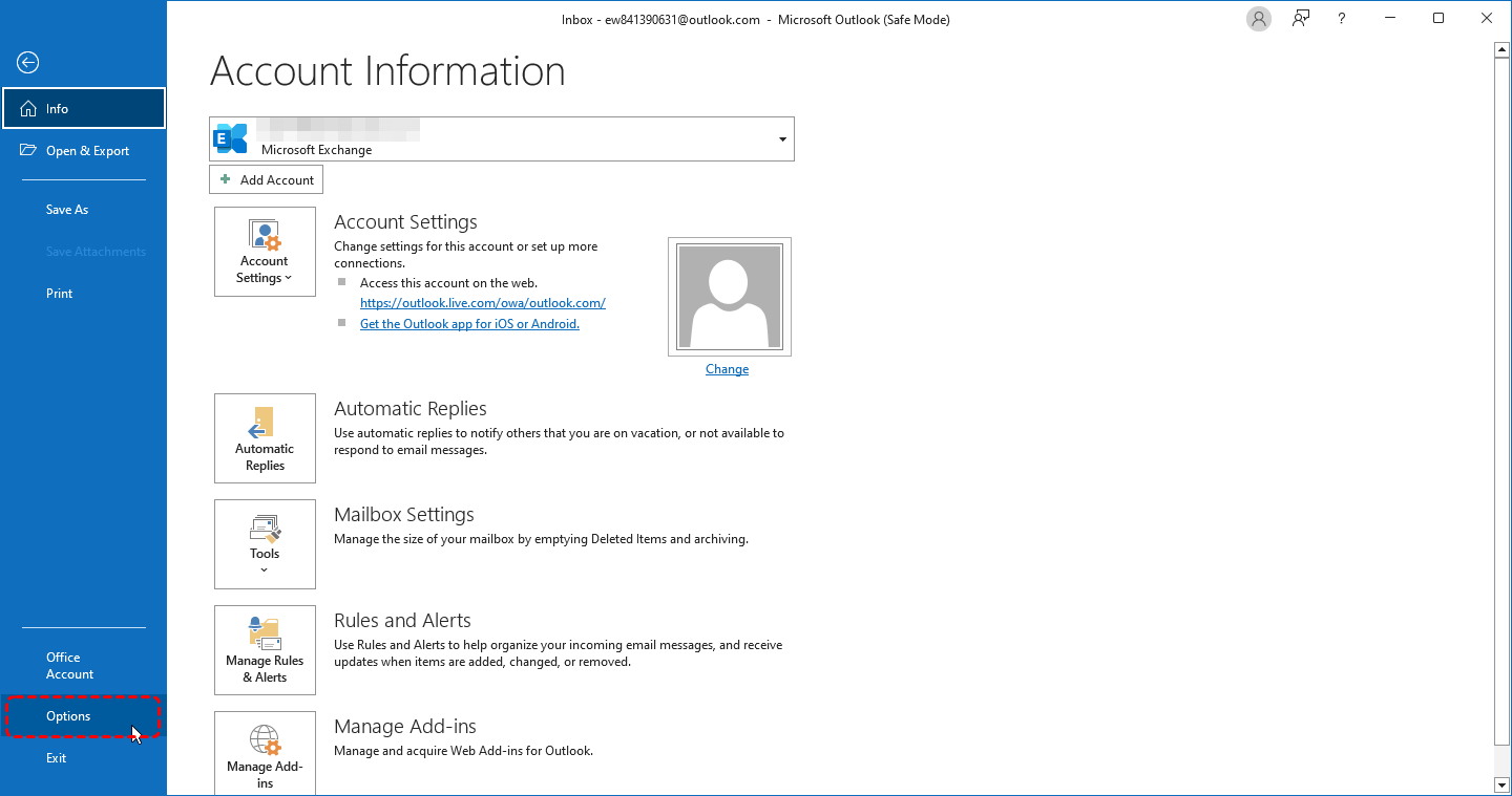 Step 1. Open Outlook (use Safe Mode if needed).Go to "File → Options".
