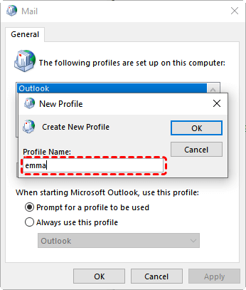 A corrupted Outlook profile is a common cause of the "Set of folders cannot be opened" error. Creating a new profile gives Outlook a fresh configuration without affecting your emails stored on the server (Exchange, Office 365, or IMAP accounts).
