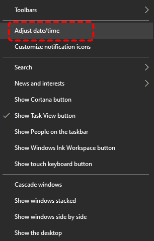 Step 1. Right-click the clock in the taskbar and select "Adjust date/time".