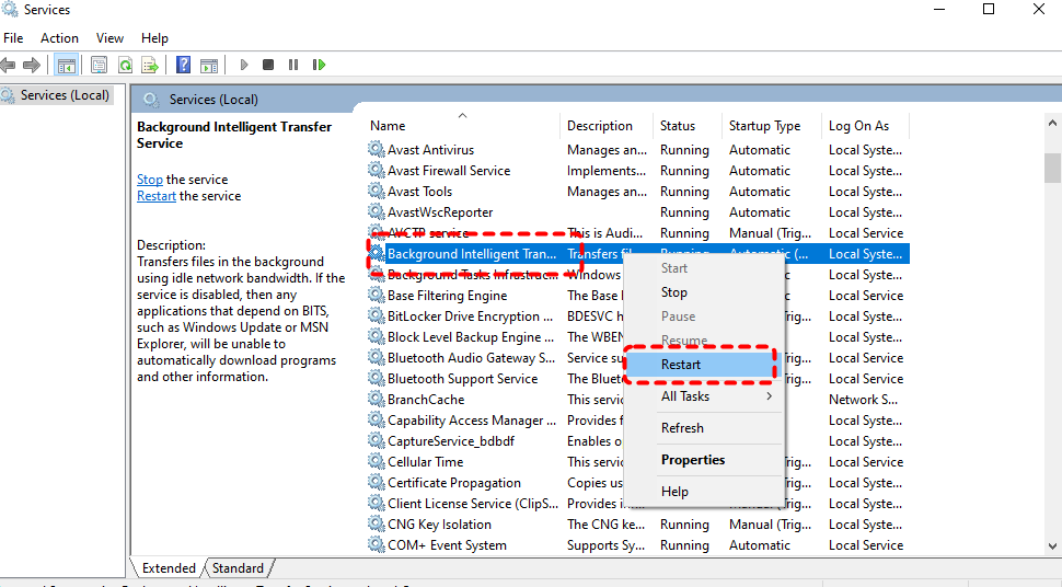 Step 2: Locate "Background Intelligent Transfer Service" from the list and right click on it, then choose "Restart".