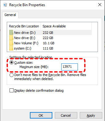Step 2. Under the General tab, you’ll see the option for Custom size. Here, you can adjust the Recycle Bin's capacity to your preferred size according your needs.
