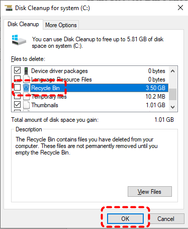 Step 3. Uncheck the "Recycle Bin" option to prevent it from being emptied automatically during the cleanup.
