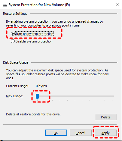 Step 3. Check the "Turn on system protection" option under the Restore Settings and assign the disk space for the restore points based on your needs, then click "Apply" and "OK" to save the settings.