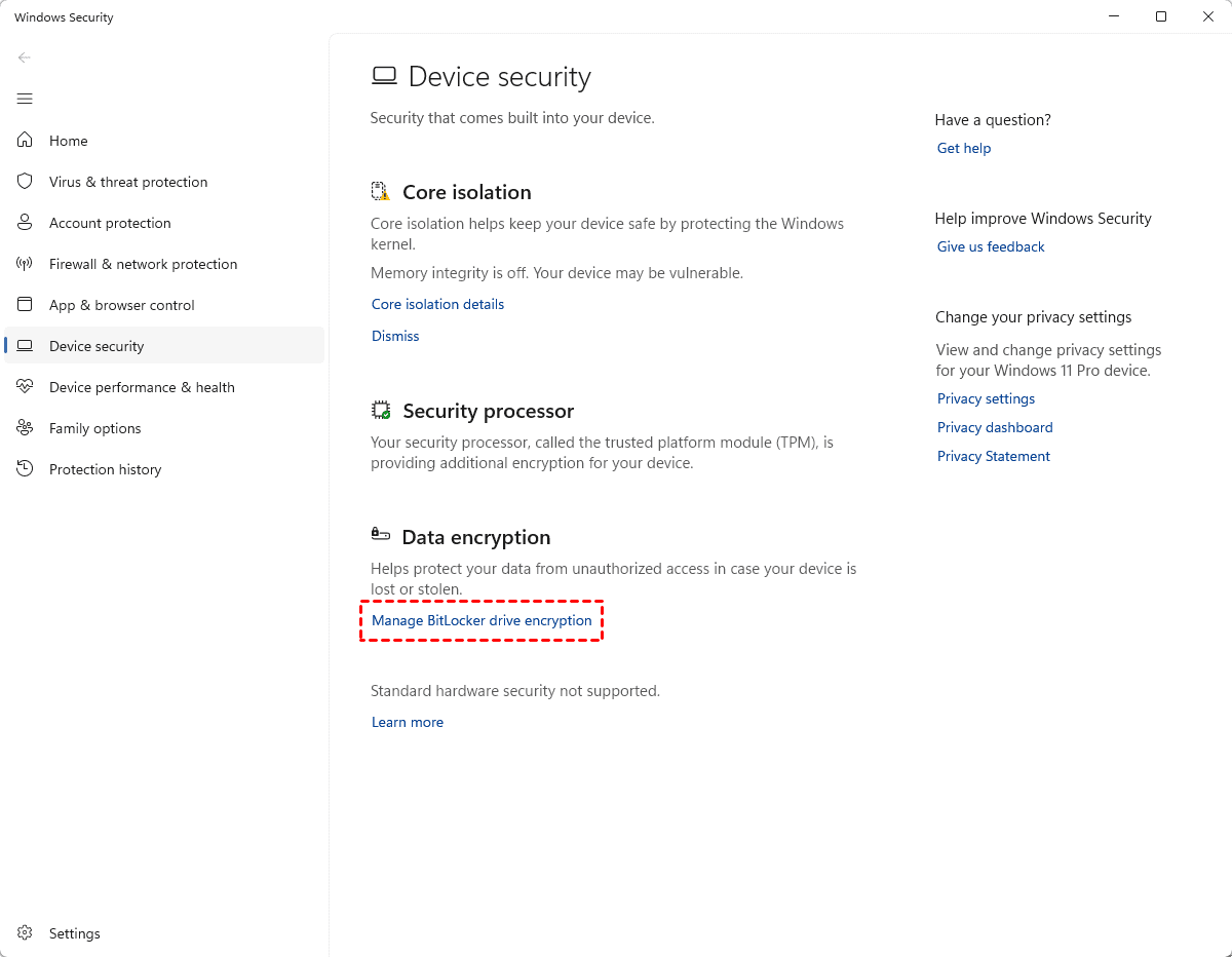 3. Click "Windows Security" > "Device Security" > “Manage BitLocker Device encryption” (or “BitLocker” on Pro/Enterprise).