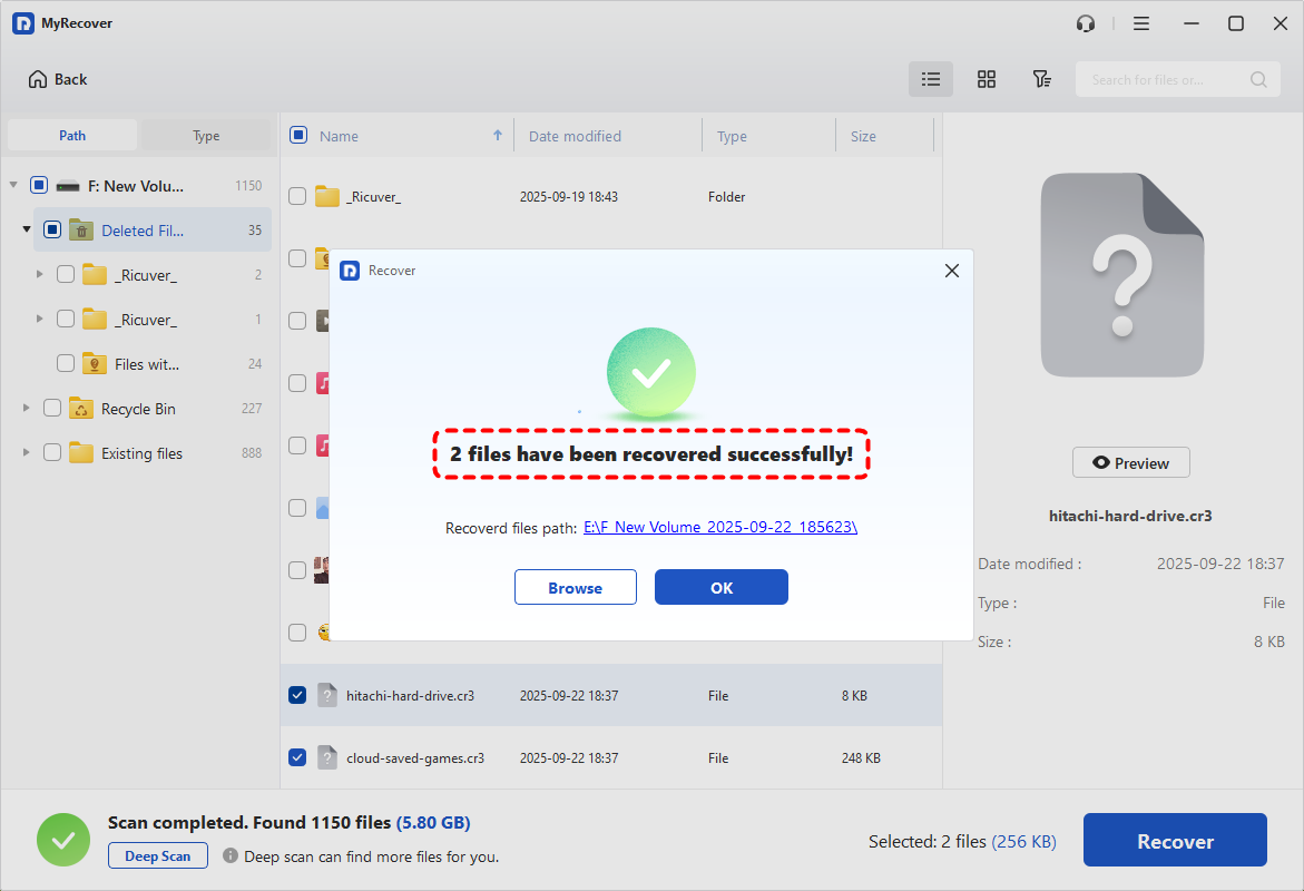 Once the process is finished, the message "Files have been recovered successfully" will pop up. You can check the recovered files by clicking on the destination folder path or "Browse" button.