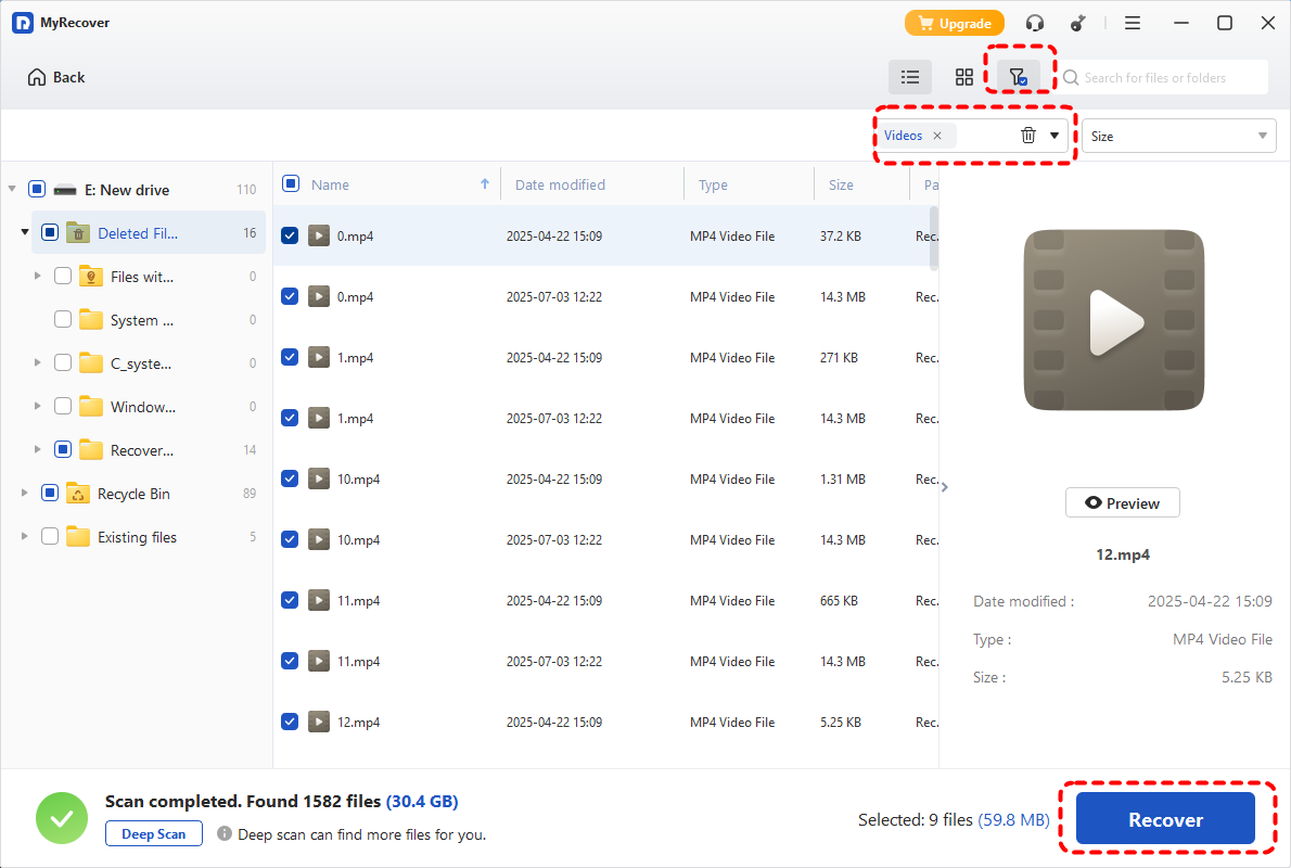 4. Once the scan completes, preview the MP4 files you want to recover and choose them.