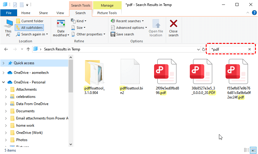 2: In the %temp% folder, click the search bar (top-right). Type "*pdf" and press Enter. Alternatively, you can check App-Specific Cache Folders since some programs store temporary PDFs in custom locations.