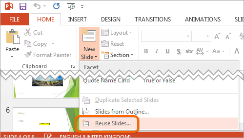 Step 4. Select Reuse Slides or Insert Slides from File.