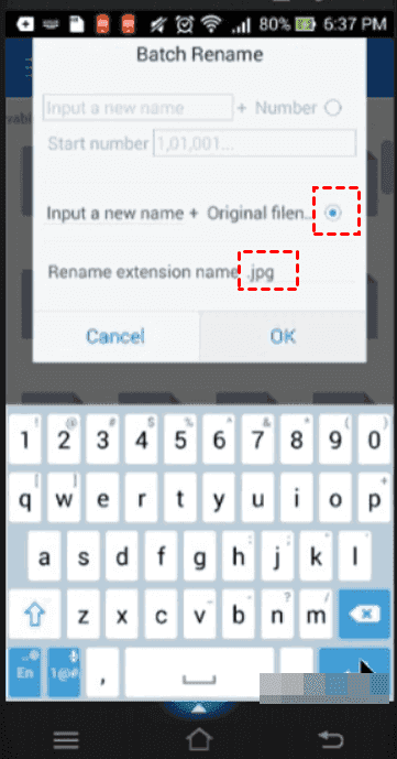 5. Tick the option Input a new name + orignal filename, and input the .jpg in the Rename extension name, and hit OK > Enter.