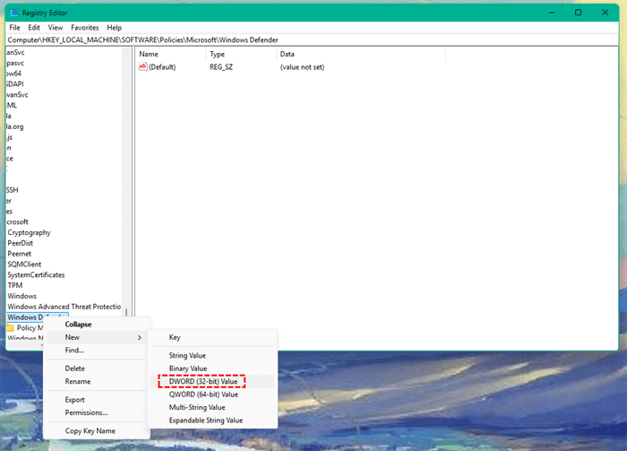 3. Right-click → New → DWORD (32-bit) Value. Name it: DisableAntiSpyware.