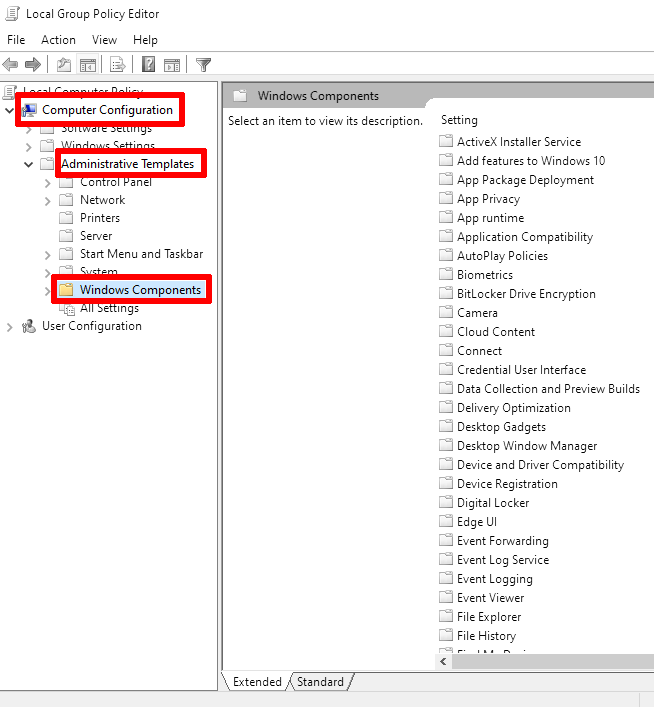 3. Navigate to: Computer Configuration → Administrative Templates → Windows Components → Microsoft Defender Antivirus.