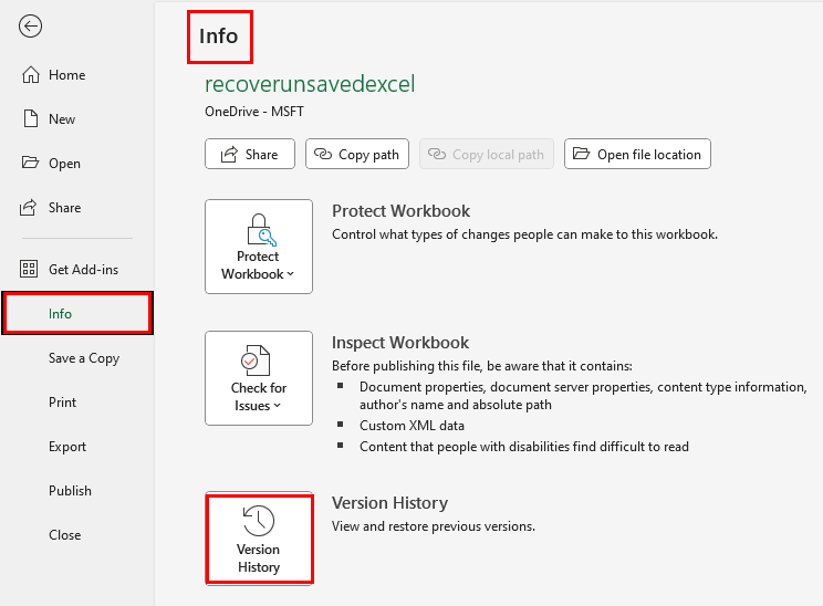 Step 1. Launch Excel and click "File" > "Info", then select "Version History".