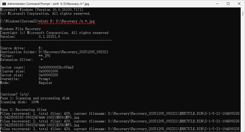 For example, to scan your E: drive for deleted JPEGs and save them to D:\Recovery, you'd use a command like: