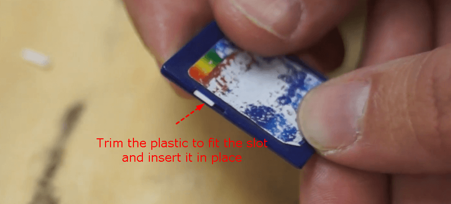When the switch is missing or broken, you can use a makeshift tool to replace the switch and simulate the locking mechanism. For example, some users have found success by using a piece of plastic from a butter container to create a temporary replacement. By trimming the plastic to fit the slot and insert it in place, they were able to restore the card’s functionality.