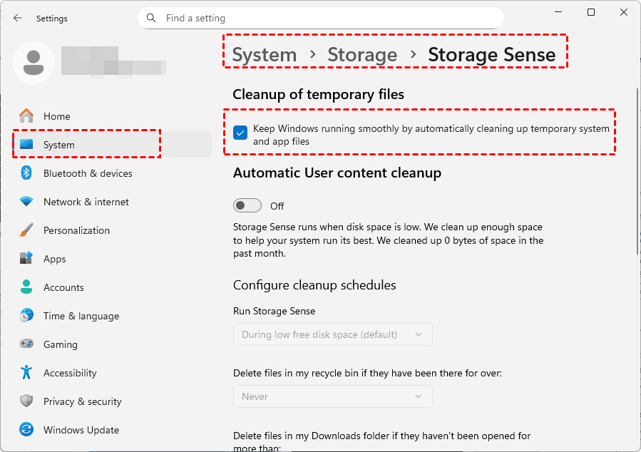 2. You can turn Storage Sense on to have Windows automatically clean up temporary files and content from your Recycle Bin on a schedule (every day, week, or month).